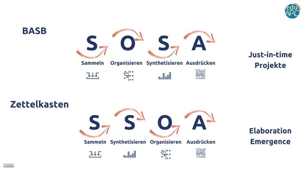 Der Sauerstoff des SOSA-Systems sind die Projekte: Sie sind es, die es uns ermöglichen, Feedback darüber zu bekommen, ob etwas funktioniert oder nicht, es ist der Moment, in dem wir in unseren eigenen Worten ausarbeiten, was wir zuvor gelesen/verzehrt haben. Der Sauerstoff der Zettelkasten-Methode sind jedoch die dauerhaften Notizen. Sie kommen viel früher als in SOSA, aber sie sind auch viel zeitaufwändiger und intensiver zu erstellen, man kann sie als Miniprojekte betrachten.