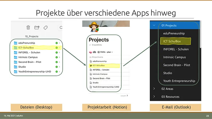 Praktisch sieht die Umsetzung von PARA bei mir so aus: Ich verwende sie über verschiedenste Applikationen hinweg und verwalte damit alle meine Daten. In meiner Datenablage nutze ich die PARA Struktur, in meiner Notiz-App, meiner E-Mail und meiner Aufgabenverwaltung. Dabei bilde ich in jeder App die gleiche Struktur ab.